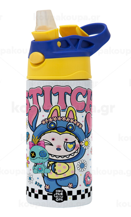 Labubu Stitch, Children's hot water bottle, stainless steel, with safety straw, green, blue (360ml) BPA FREE