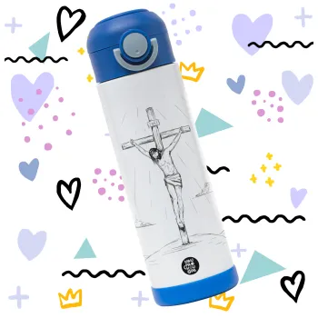 Jesus Christ , Children's hot water bottle, stainless steel, with safety straw, BLUE (500ml)