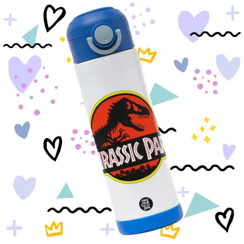 Jurassic park, Children's hot water bottle, stainless steel, with safety straw, BLUE (500ml)