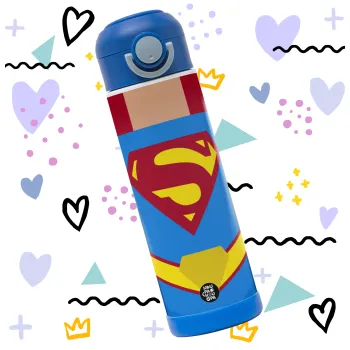 Superman flat, Children's hot water bottle, stainless steel, with safety straw, BLUE (500ml)