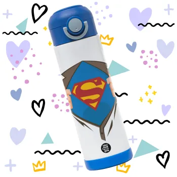 Superman hands, Children's hot water bottle, stainless steel, with safety straw, BLUE (500ml)