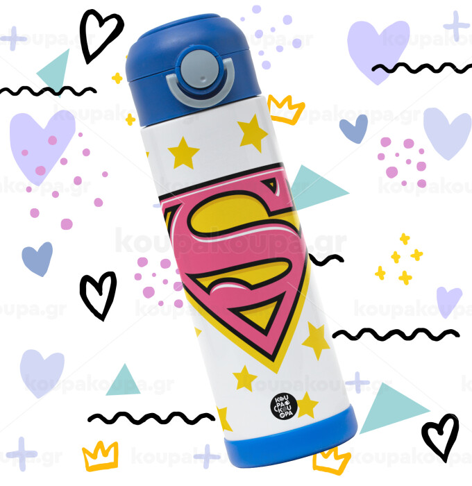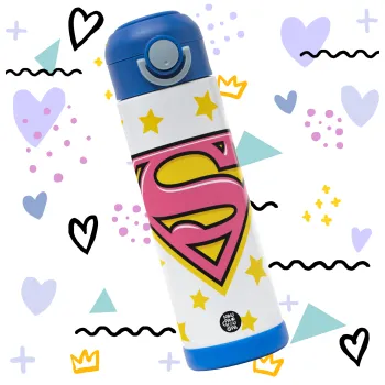 Superman Pink, Children's hot water bottle, stainless steel, with safety straw, BLUE (500ml)