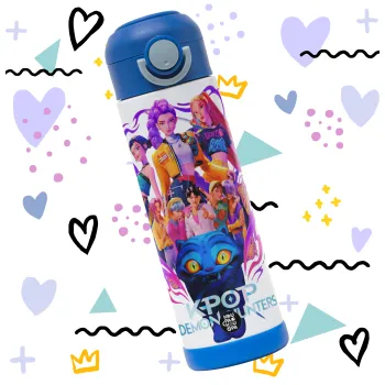 kpop Demon Hunters Huntrix, Children's hot water bottle, stainless steel, with safety straw, BLUE (500ml)