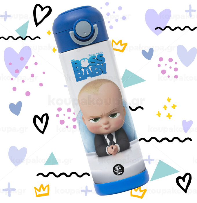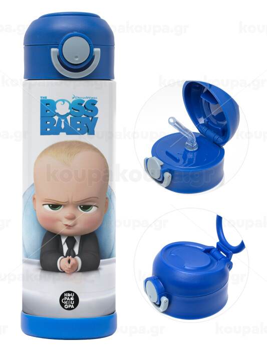 The boss baby, Children's hot water bottle, stainless steel, with safety straw, BLUE (500ml)