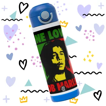 Bob marley, one love, Children's hot water bottle, stainless steel, with safety straw, BLUE (500ml)