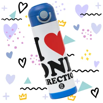 I Love, One Direction, Children's hot water bottle, stainless steel, with safety straw, BLUE (500ml)