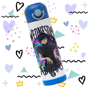 Wednesday Jenna Ortega, Children's hot water bottle, stainless steel, with safety straw, BLUE (500ml)