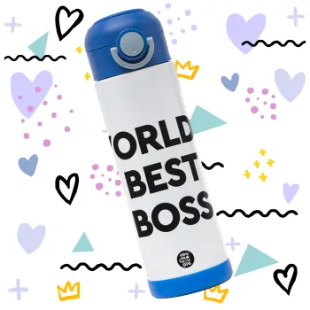 World's best boss, Children's hot water bottle, stainless steel, with safety straw, BLUE (500ml)