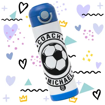 Soccer coach, Children's hot water bottle, stainless steel, with safety straw, BLUE (500ml)