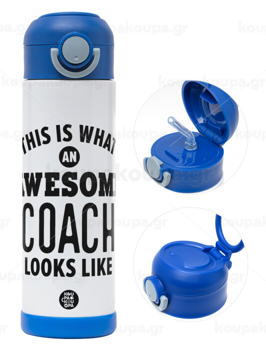 This is what an awesome COACH looks like!, Children's hot water bottle, stainless steel, with safety straw, BLUE (500ml)