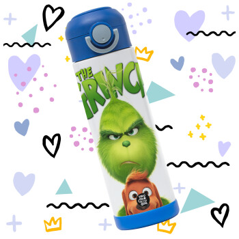 mr grinch, Children's hot water bottle, stainless steel, with safety straw, BLUE (500ml)
