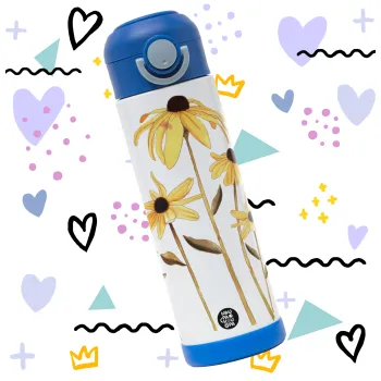 Daisies flower, Children's hot water bottle, stainless steel, with safety straw, BLUE (500ml)