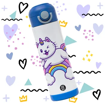 Cute cat unicorn, Children's hot water bottle, stainless steel, with safety straw, BLUE (500ml)