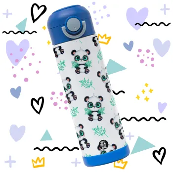 Panda, Children's hot water bottle, stainless steel, with safety straw, BLUE (500ml)