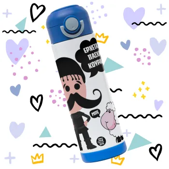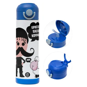 Κρητικός "Έρχεται Πάσχα κουράδι", Children's hot water bottle, stainless steel, with safety straw, BLUE (500ml)