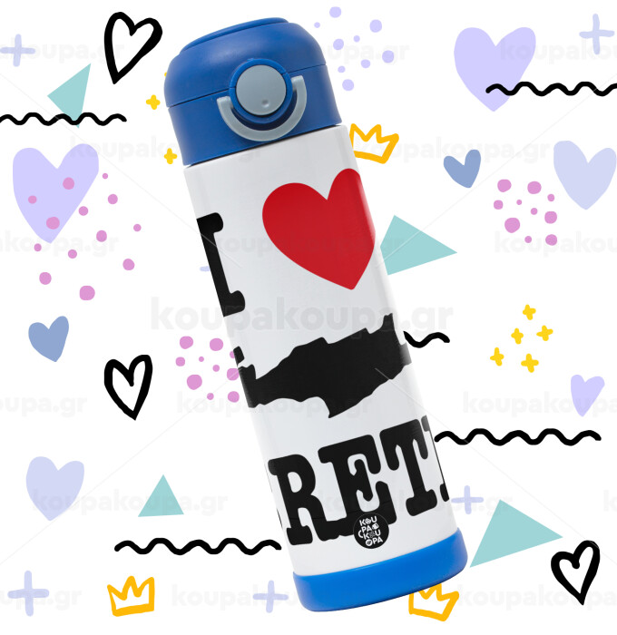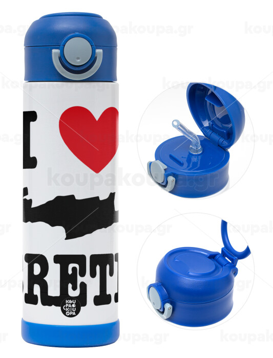 I Love Crete, Children's hot water bottle, stainless steel, with safety straw, BLUE (500ml)