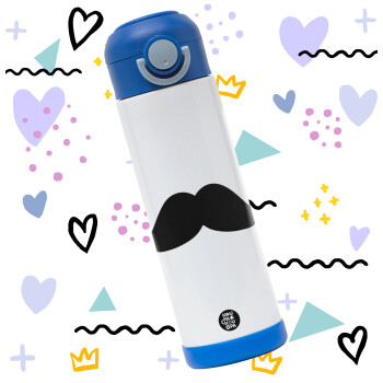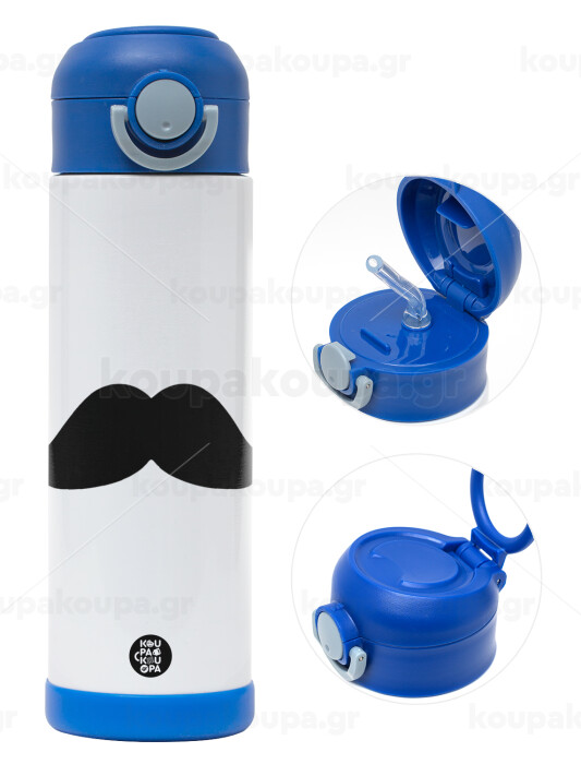 moustache, Children's hot water bottle, stainless steel, with safety straw, BLUE (500ml)