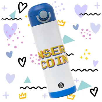 Insert coin!!!, Children's hot water bottle, stainless steel, with safety straw, BLUE (500ml)