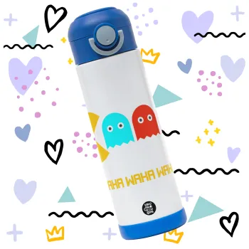 Pacman waka waka waka, Children's hot water bottle, stainless steel, with safety straw, BLUE (500ml)