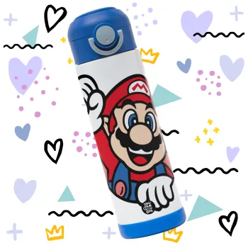 Super mario win, Children's hot water bottle, stainless steel, with safety straw, BLUE (500ml)