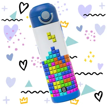Tetris blocks, Children's hot water bottle, stainless steel, with safety straw, BLUE (500ml)