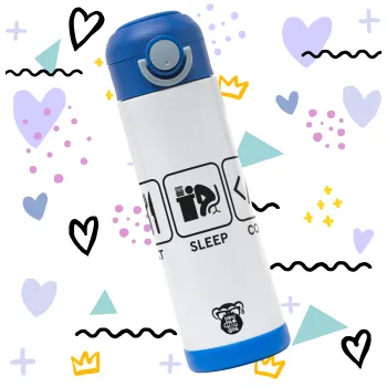 Eat Sleep Code, Children's hot water bottle, stainless steel, with safety straw, BLUE (500ml)