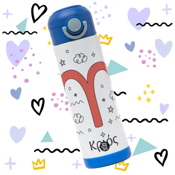 Ζώδια Κριός, Children's hot water bottle, stainless steel, with safety straw, BLUE (500ml)