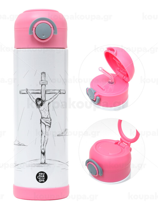 Jesus Christ , Children's hot water bottle, stainless steel, with safety straw, PINK (500ml)