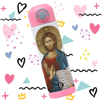 Jesus, Children's hot water bottle, stainless steel, with safety straw, PINK (500ml)