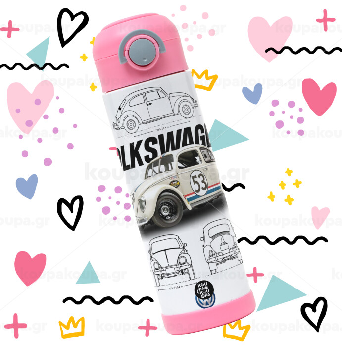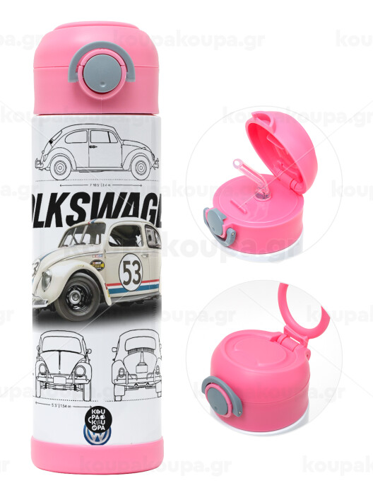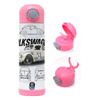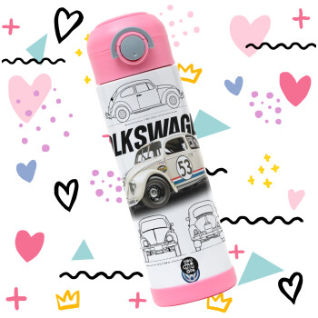 Volkswagen Beetle, Children's hot water bottle, stainless steel, with safety straw, PINK (500ml)