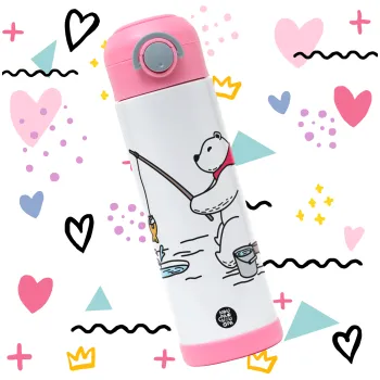 Bear fishing, Children's hot water bottle, stainless steel, with safety straw, PINK (500ml)