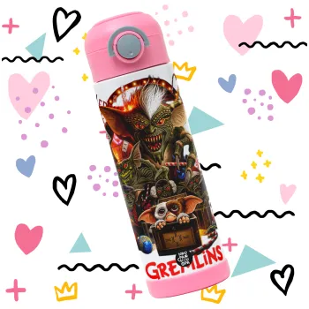 Gremlins, Children's hot water bottle, stainless steel, with safety straw, PINK (500ml)