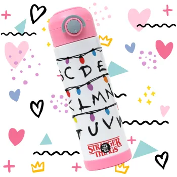 Stranger Things ABC, Children's hot water bottle, stainless steel, with safety straw, PINK (500ml)