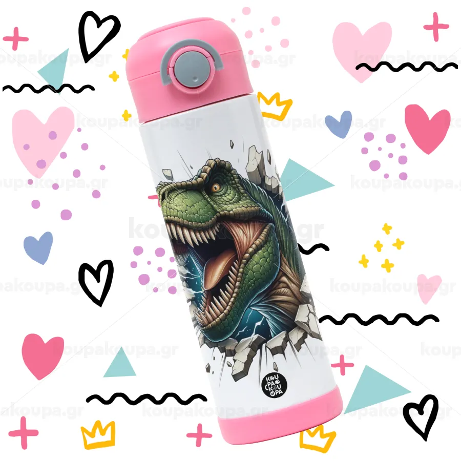 Dinosaur break wall, Children's hot water bottle, stainless steel, with safety straw, PINK (500ml)