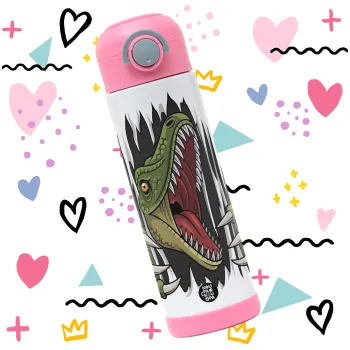 Dinosaur scratch, Children's hot water bottle, stainless steel, with safety straw, PINK (500ml)