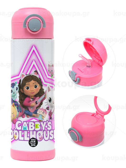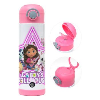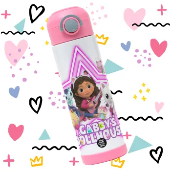 Gabby Dollhouse, Children's hot water bottle, stainless steel, with safety straw, PINK (500ml)