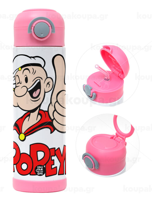 Popeye the sailor man, Children's hot water bottle, stainless steel, with safety straw, PINK (500ml)