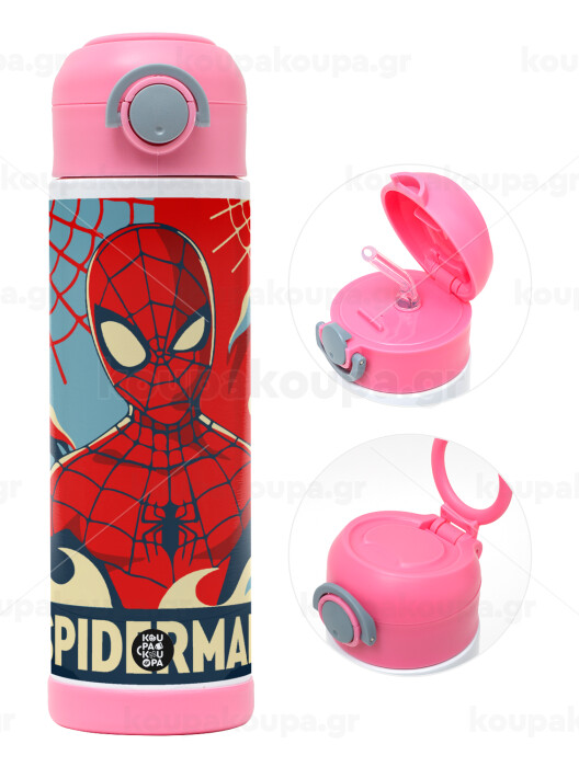 Spiderman kid, Children's hot water bottle, stainless steel, with safety straw, PINK (500ml)