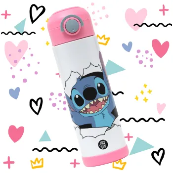 Stitch hello!!!, Children's hot water bottle, stainless steel, with safety straw, PINK (500ml)
