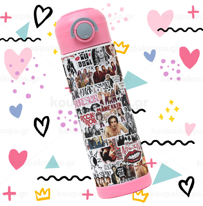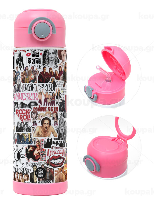 Maneskin stickers, Children's hot water bottle, stainless steel, with safety straw, PINK (500ml)