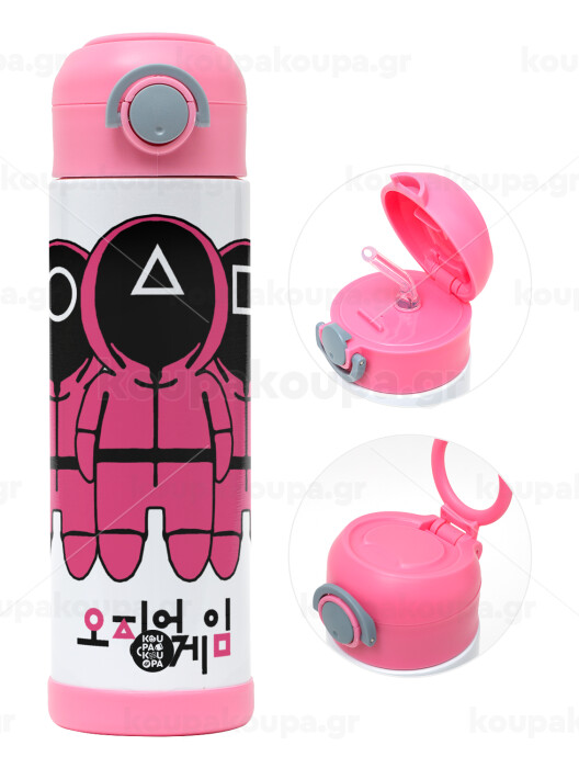 The squid game, Children's hot water bottle, stainless steel, with safety straw, PINK (500ml)