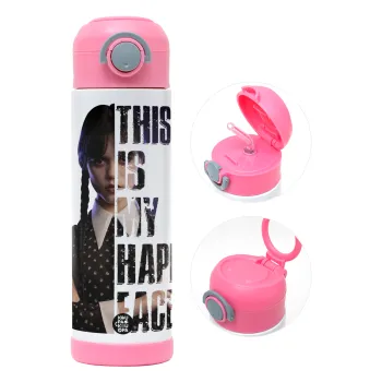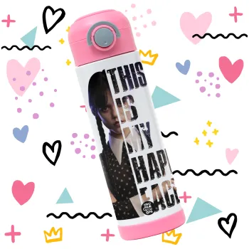 Wednesday, This is my happy face, Children's hot water bottle, stainless steel, with safety straw, PINK (500ml)