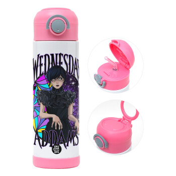 Wednesday Jenna Ortega, Children's hot water bottle, stainless steel, with safety straw, PINK (500ml)