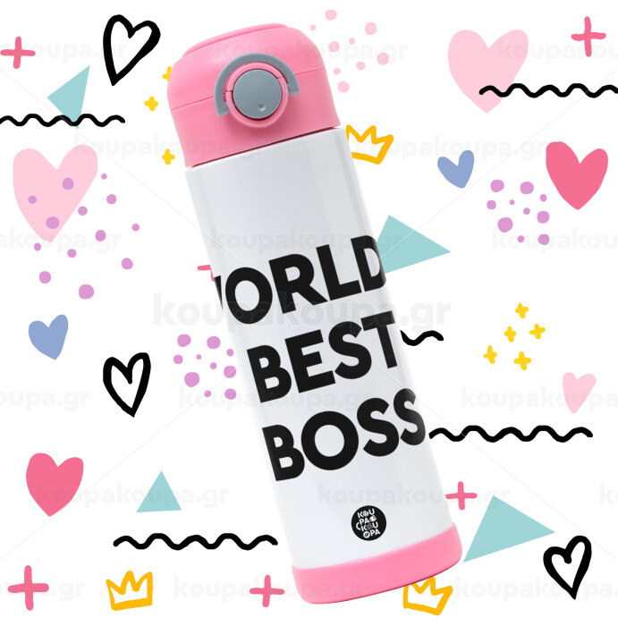 World's best boss, Children's hot water bottle, stainless steel, with safety straw, PINK (500ml)