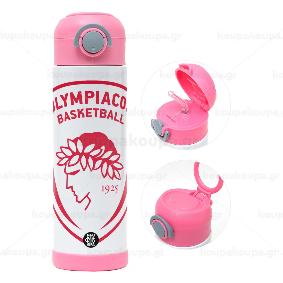 Olympiacos B.C., Children's hot water bottle, stainless steel, with safety straw, PINK (500ml)