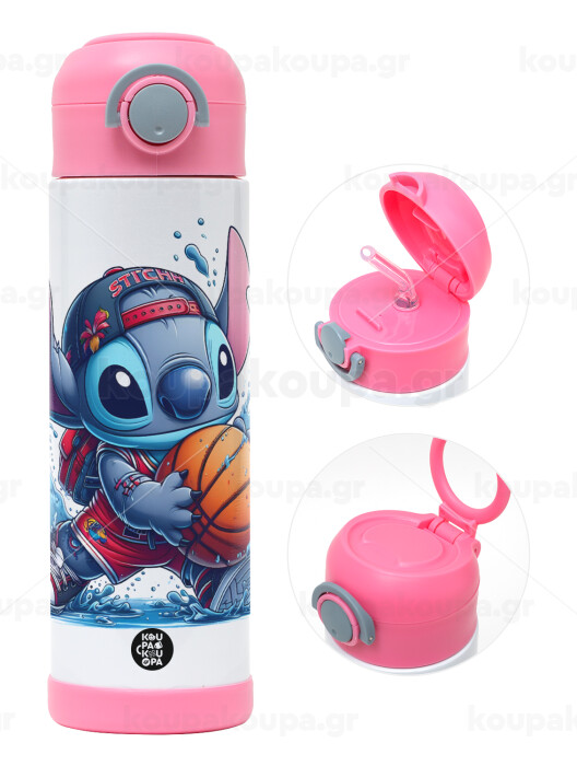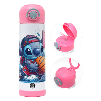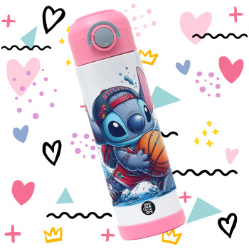 Stitch Basketball, Children's hot water bottle, stainless steel, with safety straw, PINK (500ml)