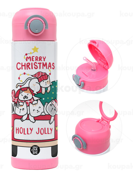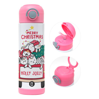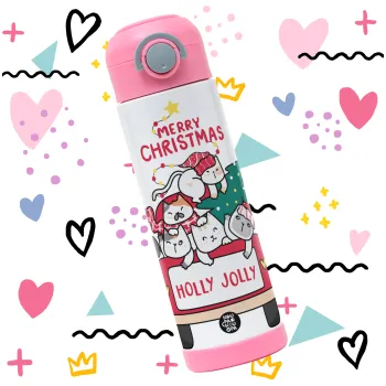 Merry Christmas cats in car, Children's hot water bottle, stainless steel, with safety straw, PINK (500ml)