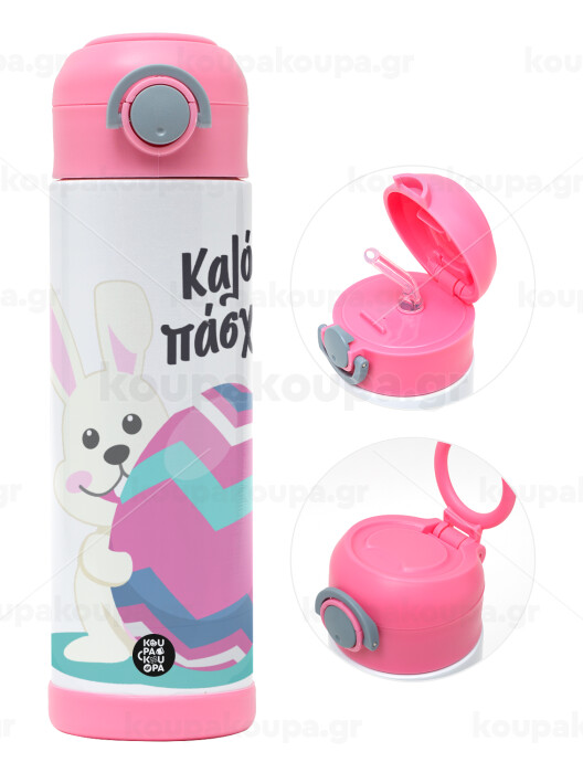 Καλό πάσχα, Children's hot water bottle, stainless steel, with safety straw, PINK (500ml)