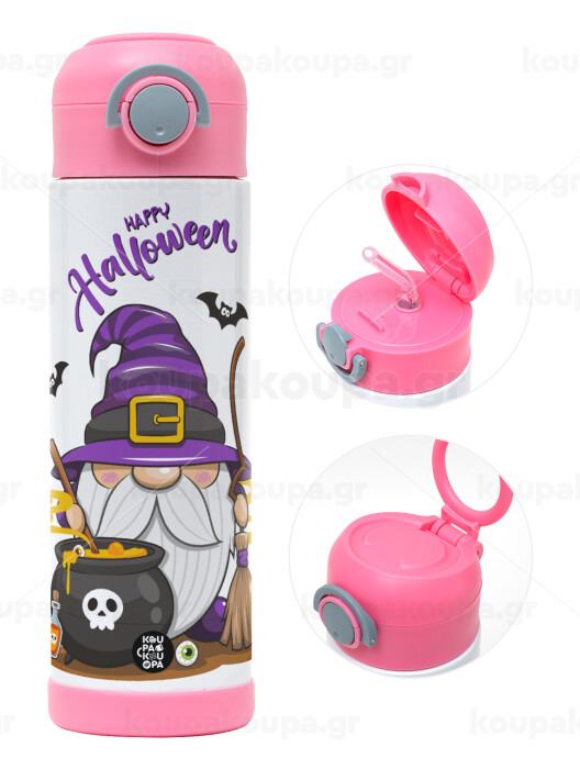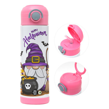 Happy Halloween (Χαλοουίν), Children's hot water bottle, stainless steel, with safety straw, PINK (500ml)