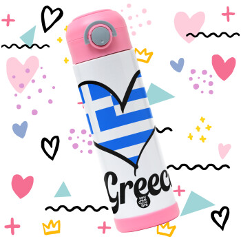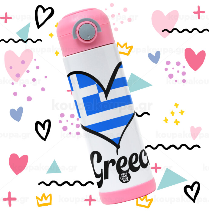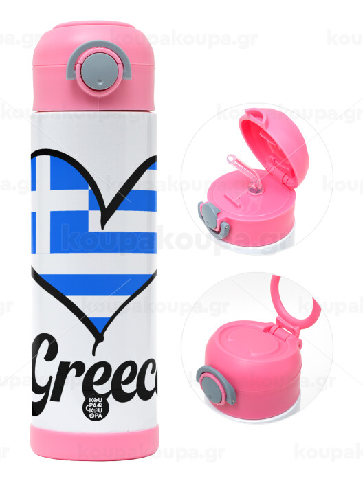 Greece flag, Children's hot water bottle, stainless steel, with safety straw, PINK (500ml)
